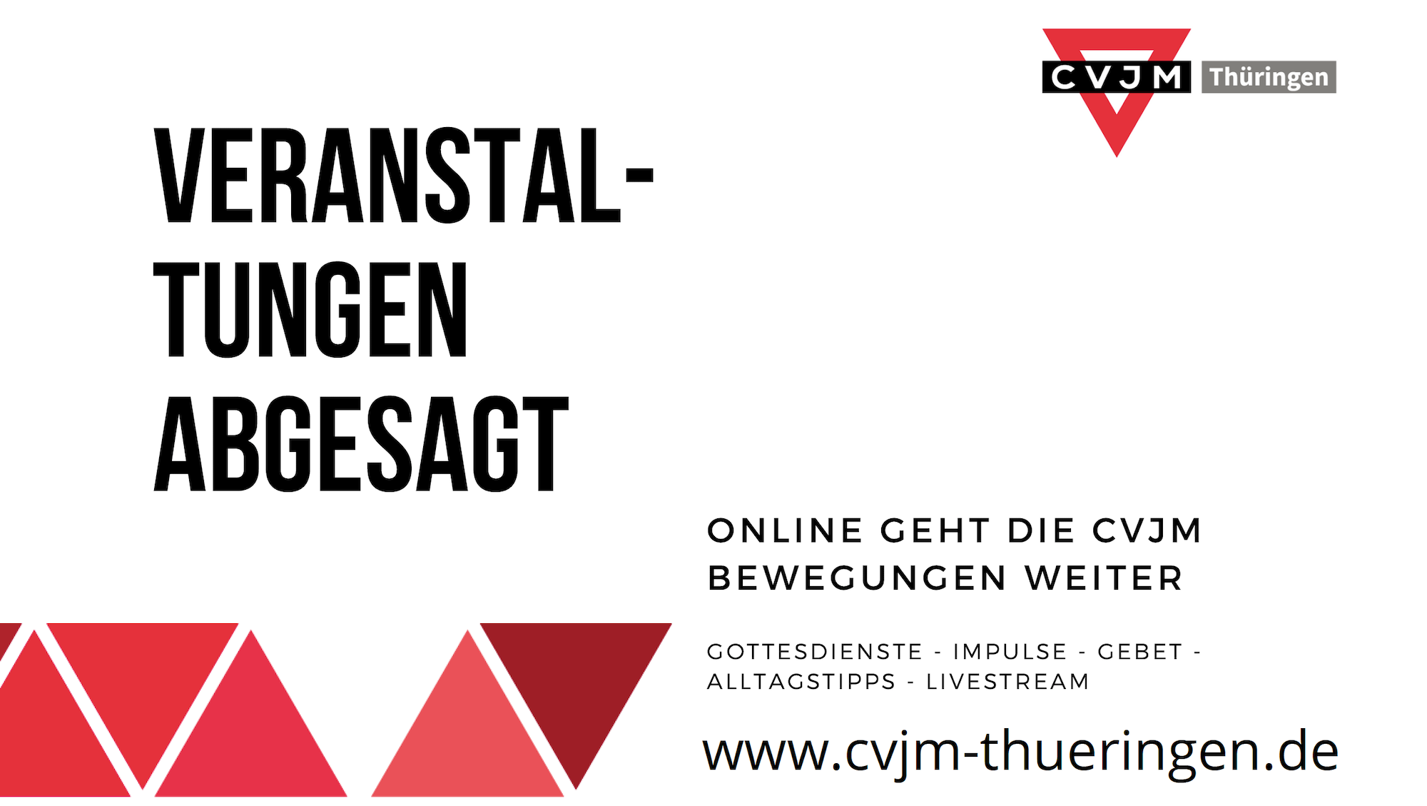 Jetzt ist viel Raum für Neues: raus in die Natur gehen, auf Gott hören, Nächstenliebe leben, Kreativität entfalten bei der Gestaltung der CVJM Bewegung online. Auf unserer Startseite des CVJM Thüringen findest du viele Anregungen, z.B. online Gottesdienst feiern, Gebetshotline, Livestream-Gebet, JesusHouse Stream, Zu HauseUmZehn,... Klick dich rein. Wir aktualisieren diese Seite ständig.